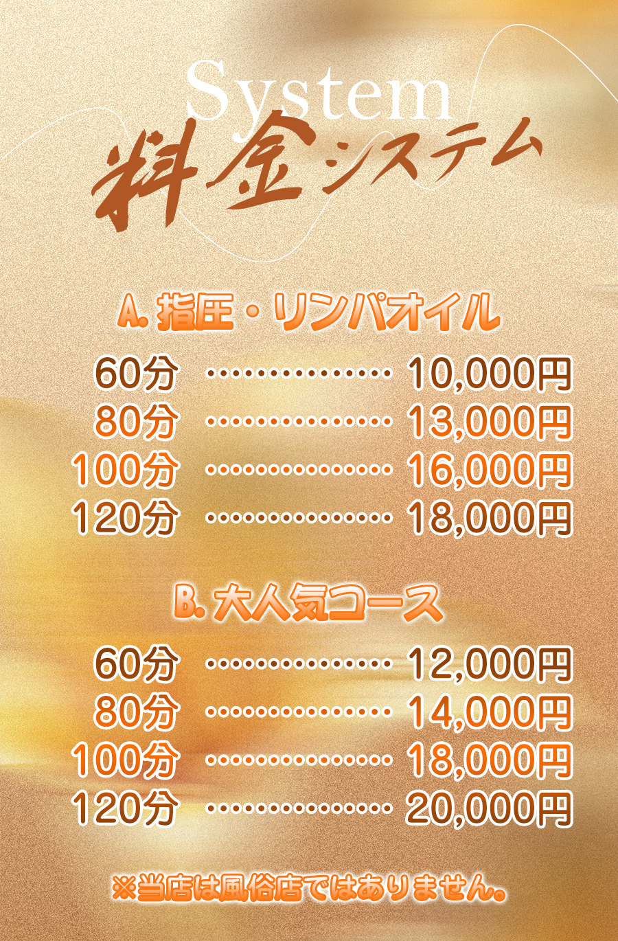他店とは一味違うサービスできっと満足いただけるお店を目指します。日々お仕事にお疲れのみなさま。無理をなさらず、疲れをためこまず、ぜひ当店へお越し下さい。